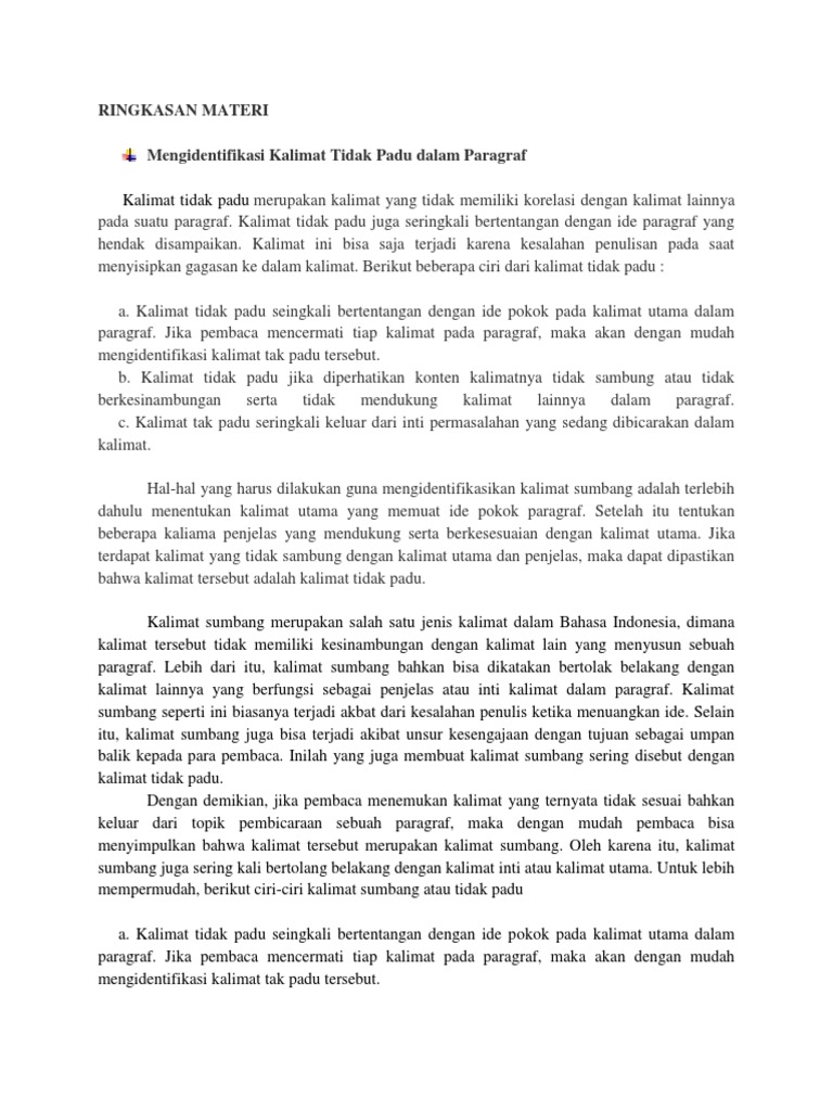 Menentukan Kalimat Tidak Padu - Kalimat Tidak Padu Pada Paragraf Tersebut Ditunjukkan Pada Kalimat Nomor Brainly Co Id Cute766 / Agar kalimat tersebut memiliki kejelasan struktur, perlu kecermatan dapat dilakukan dengan memilih bentuk sinonimi yang paling tepat.. Kalimat utama disebut juga dengan kalimat topik, yang berarti kalimat yang dijadikan acuan dalam pengembangan paragraf. Pada struktur kalimat ini ada penambahan unsur objek (o). Kalimat tidak efektif antara lain ditandai dengan ketidaklengkapan unsur kalimat, ketidaktepatan penempatan unsur dalam kalimat, penggunaan unsur kalimat secara berlebihan, pilihan kata tidak tepat, ketidakparalelan, kontaminasi. 0 ratings0% found this document useful (0 votes). Untuk itulah diperlukan kalimat efektif dalam berkomunikasi contoh kalimat dengan kesatuan atau kepaduan gagasan: